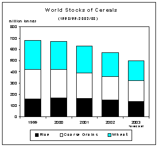 World cereal stocks by the end of the crop seasons in 2003 are likely to fall again, to 498 million tonnes, down 72 million tonnes, or 13 percent, from their already reduced opening levels and 17 million tonnes lower than was reported in May. The revision is largely due to a cut of 25 million tonnes in the forecast for global cereals production in 2002. At the global level, the anticipated decline in wheat inventories would be the most significant, but coarse grains and rice stocks are also likely to fall sharply.
