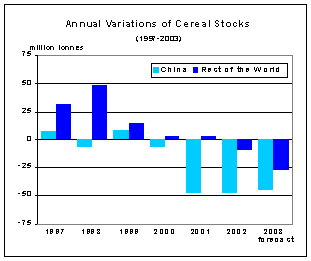 Turning to the current season (ending in 2002), stocks are forecast at 150 million tonnes, a decline of about 14 million tonnes, of which 13 million tonnes is accounted for by China – a slightly higher reduction than was anticipated earlier. Further downward revisions from the last report have also been made to the estimates of ending stocks for Japan, Thailand and the United States. By contrast, in Viet Nam, because of reduced export prospects, a larger stock buildup is likely. In India, rice purchases by the Government have been on the rise because of a record crop, which is expected, to boost public rice inventories to an unprecedented high level.