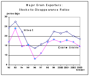 Global coarse grain inventories for crop years ending in 2003 are currently put at 188 million tonnes, down slightly since the previous report but 21 million tonnes, or 10 percent, below their opening levels. In China, high exports coupled with growing domestic feed demand would require a further drawdown of maize stocks, although maize output is anticipated to be bigger than last year. In Brazil, the decline in maize output combined with continuing large exports would result in stocks to fall back to more normal levels. Sharp declines in stocks are also anticipated among many countries in Africa, especially in southern Africa where extreme food shortages persist and white maize is in low supply as a result of poor crops. Among the major exporters, only in Canada, where crop prospects for barley and oats point to higher production, could stocks increase. In the United States, coarse grain inventories are forecast to decline given the prospects for higher exports and domestic use. Smaller barley and sorghum production in Australia would also result in a drop in the end-of-season stocks in that country while, in the EC, overall coarse grain stocks are likely to get smaller in light of improved export prospects for barley, somewhat lower maize and rye production, and stronger feed use as imports of feed wheat are likely to be curtailed following an unexpected surge in the previous season. On the whole, the ratio of major exporters' coarse grain stocks to their total disappearance could fall below 15 percent, down from the estimated 17 percent in 2001/02 and the smallest ratio since the mid-1990s.