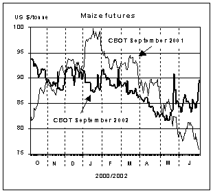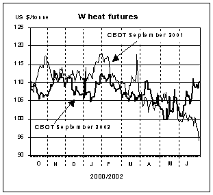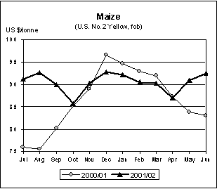 International wheat prices rose considerably over the past two months, mostly in response to less favourable crop prospects in a number of major exporting countries. In June, the U.S. wheat No. 2 (HRW, fob) averaged US$133 per tonne, up US$8 per tonne from April and US$3 per tonne more than in the corresponding month last year. However, the increase in US soft wheat prices have been less pronounced mainly because of large supplies of low quality wheat from non-traditional sources, especially from India and Ukraine. Despite the economic problems in Argentina, export commitments are approaching the total availability of around 10 million tonnes and Argentine prices have risen sharply beyond last year’s level. In the EC, large supplies and the strengthening of Euro against the US Dollar have prompted the return of export subsidies (maximum refund of €5).