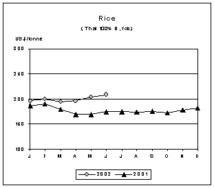 In June, the Thai 100% B surpassed the US$200 per tonne benchmark for the first time in two years, being quoted at US$210 per tonne. Although prices for the United States long grain 2/4 percent also recovered in May and June, at US$202 per tonne, they fell for the first time below their Thai counterpart quotations. For comparison, this same rice was quoted US$282 per tonne in June 2001.