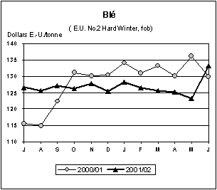 Un certain nombre de grands pays exportateurs devraient réaliser des récoltes relativement médiocres; de ce fait, les cours internationaux du blé ont engistré une forte augmentation au cours des deux derniers mois. En juin, le prix moyen du blé n° 2 des États-Unis (blé roux d’hiver, fob) était de 133 dollars E.-U., ce qui représente une hausse de 8 dollars par rapport au mois d’avril et de 3 dollars par rapport au mois de juin de l’an dernier. La hausse du prix du blé tendre des États-Unis a cependant été moins prononcée en raison de l’importance des quantités disponibles de blé de faible qualité provenant d’exportateurs inhabituels (principalement l’Inde et l’Ukraine). Malgré les difficultés économiques auxquelles elle est confrontée, l’Argentine devrait pouvoir assurer l’ensemble de ses exportations, qui portent sur un volume avoisinant les 10 millions de tonnes. Dans la CE, l’abondance des réserves et l’appréciation de l’euro par rapport au dollar ont suscité une réintroduction des subventions à l’exportation (remboursement maximal de 5 euros).