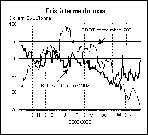À la bourse de Chicago, les contrats à terme sur le maïs ont grimpé jusqu'à 90 dollars E.-U. à la fin du mois de juin, ce qui représente 14 dollars de plus que l’an dernier. Il est difficile de prévoir l’évolution des cours du maïs (ce qui n’est pas le cas pour le blé). En effet, alors que la demande mondiale d’importation pourrait laisser supposer une légère hausse par rapport à l’an dernier, l’abondance des réserves de blé fourrager pourrait freiner la demande de maïs sur certains marchés. Il reste par ailleurs difficile d’évaluer avec précision les capacités d’exportation de la Chine et du Brésil.