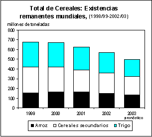 Con toda probabilidad, al final de las campañas agrícolas de 2003 las existencias mundiales de cereales volverán a descender, para situarse en 498 millones de toneladas, 72 millones de toneladas, o sea 13 por ciento, menos que sus niveles ya reducidos de apertura y 17 millones de toneladas menos que en el informe de mayo. La revisión se debe principalmente a una reducción de 25 millones de toneladas en el pronóstico de la producción mundial de cereales en 2002. En el plano mundial, la contracción más significativa sería la de las existencias de trigo, pero es posible que también desciendan de forma pronunciada las de cereales secundarios y arroz.