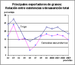 Las existencias totales de trigo de los cinco exporta-dores principales podrían acusar una contracción pro-nunciada, lo que implicaría también un descenso de la relación entre dichas existencias y su desaparición total (el consumo interno más las exportaciones) estimada en 18,5 por ciento, la más baja en cuatro años. Es probable que las existencias de trigo de los Estados Unidos desciendan a su nivel más bajo desde 1997, debido a una mengua de la producción por cuarto año consecutivo. También se prevé una merma de las existencias de Canadá y Australia, pero las de la CE alcanzarán niveles jamás vistos desde 1993 debido a una producción sin precedentes.