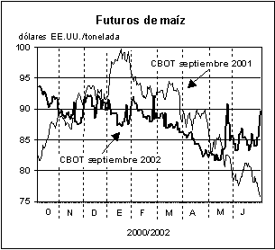 También los precios internacionales del maíz se han fortalecido en los últimos meses. En junio, el maíz No. 2 de los Estados Unidos (fob) alcanzó un promedio de 92 dólares EE.UU. por tonelada, 5 dólares EE.UU. más por tonelada que en abril y 9 dólares EE.UU. más por tonelada que en el período correspondiente del año pasado. La aceleración del ritmo de las importaciones en las últimas semanas también ha servido para sostener los precios. Según se informa, los que han subido más abruptamente han sido los precios del maíz blanco, debido a una demanda excepcionalmente fuerte del África austral a causa del empeoramiento de las emergencias alimentarias. En el CBOT, también los futuros de maíz continuaron estando por encima de los valores del año pasado en vista de la merma de las cosechas en los países del hemisferio sur y de las perspectivas de menores exportaciones de la Argentina.