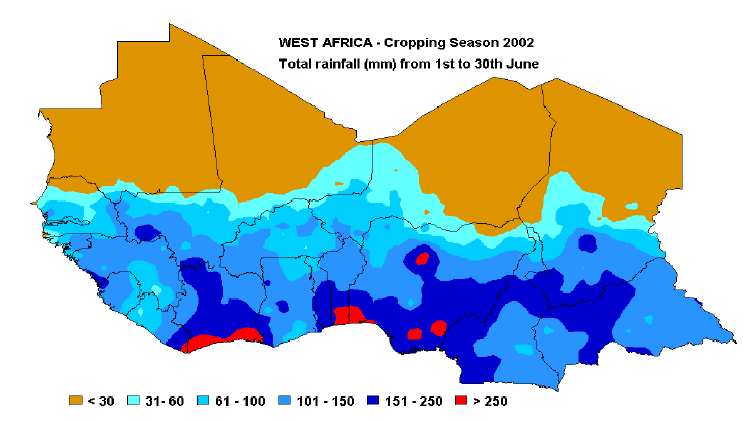 The first map indicates the total rainfall amount from 1st to 30th June. Data is extracted from FAO field reports and the RainFall Estimate (RFE) Satellite Imagery as produced by NOAA/USGS/FEWS/USAID project. The RFE images are obtained by interpolating various parameters recorded on the ground and obtained through remote sensing measurements such as: rainfall, relative humidity, wind speed, elevation, cold cloud temperatures.