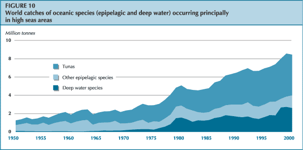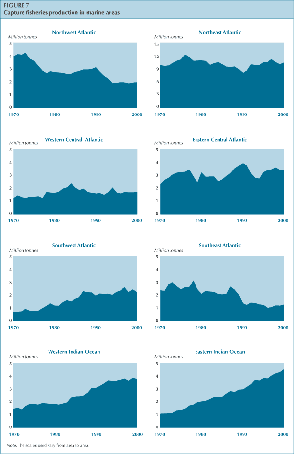 Following a decline to 79.2 million tonnes in 1998, total production of marine capture fisheries increased to 84.7 million tonnes in 1999 and 86.0 million tonnes in 2000, thus recovering to levels close to the historical maximum recorded for 1996 and 1997. If China is excluded (see Box 2), world production in 2000 was 71.3 million tonnes - about 5 percent less than the historical peak of 75.5 million tonnes in 1995. Most of the recent changes in total global landings from wild marine fishery resources can be explained by the decline and rapid recovery (in biomass and production volumes) that followed the 1997-1998 El Niño. The areas most seriously affected by this recent El Niño were the Southeast Pacific and, to a lesser extent, the Eastern Central Pacific (Figure 7).