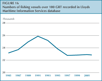 BOX 4 Lloyds Maritime Information Services aims to maintain a full picture of all ships, including fishing vessels, of more than 100 gross registered tons (GRT). Vessels are continually added to the database each year; some of these are new vessels that were built that year and others are added as information becomes available. Vessels of more than 100 GRT are the most likely to operate internationally, through access agreements and on the high seas, but these represent only a small proportion of the global fishing fleet. Nevertheless, monitoring the > 100 GRT fleet gives an indication of the changing shape of large-scale industrial fishing (Figure 16). It provides indications of the patterns of change in entries to, and exits from, all shipping registers, particularly open registers. By definition, these registers offer flag state status to almost any ship and are often seen by vessel owners as a means of avoiding controls to which they might otherwise be subject. The number of vessels that are known to exist but for which the flag is unknown is also a cause for concern, although some of these vessels might have been removed from the register before being scrapped. The numbers of vessels in the major open registers with unknown flags are shown in Figure 17. The number of newly built fishing vessels added to the register has remained about 300 per year in recent years, but reductions through scrapping and loss mean that there has been a net reduction in the fleet. The major changes to fleets in the last two years are shown in Table 6. The extent of reflagging in the fishing fleet can be measured by comparing the database in sequential years and by following each vessel through its unique Lloyds or International Maritime Organization (IMO) number (Table 7). Source: A. Smith, FAO Fisheries Department. |