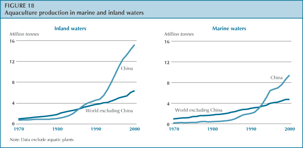According to FAO statistics, aquaculture's contribution to global supplies of fish, crustaceans and molluscs continues to grow, increasing from 3.9 percent of total production by weight in 1970 to 27.3 percent in 2000. Aquaculture is growing more rapidly than all other animal food producing sectors. Worldwide, the sector has increased at an average compounded rate of 9.2 percent per year since 1970, compared with only 1.4 percent for capture fisheries and 2.8 percent for terrestrial farmed meat production systems. The growth of inland water aquaculture production has been particularly strong in China, where it averaged 11.5 percent per year between 1970 and 2000 compared with 7.0 percent per year in the rest of the world over the same period. Mariculture production in China increased at an average annual rate of 14 percent, compared with 5.4 percent in the rest of the world. However, there is a possibility that China's aquaculture production, particularly its growth since the early 1990s, has been overestimated in the statistics (see Box 2). Figure 18 shows trends in inland and marine aquaculture production for China and the rest of the world.