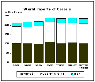 The forecast for world cereal trade in 2002/03 has been lowered to 236 million tonnes, slightly up from the previous forecast in July. At the current forecast level, world trade in cereals in 2002/03 would be some 4 million tonnes below the previous season, which was a record. Among the individual cereals, however, world trade in wheat is expected to contract sharply this season while coarse grain trade is expected to rise (mostly maize and sorghum). Rice trade in 2003 is also seen higher than in 2002.