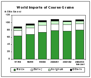 Since the last report, the forecast for world trade in coarse grains in 2002/03 has been raised by 1.5 million tonnes, to 108 million tonnes. This month’s upward adjustment mostly reflects higher expected imports by Canada and larger food aid shipments to a number of countries in southern Africa. This increase would more than offset downward revisions to the forecasts for imports by Brazil as well as several importing countries in Asia and Europe. At the current forecast level, world trade in coarse grains would be some 1.5 million tonnes higher than the previous year’s reduced volume. The anticipated small expansion would be driven largely by higher maize shipments (up 3 million tonnes). Trade in sorghum is seen to rise slightly but barley purchases are expected to decline due to sharp production shortfalls in Australia and Canada. Trade in other coarse grains would also remain mostly below the previous season’s levels.
