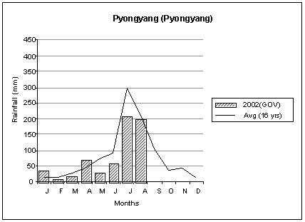 In winter 2001/02, there was less snowfall compared to the previous year. The onset of spring, on the plains and lowlands, was reported as "earlier than normal". Rainfall was experienced nation-wide from mid-April to mid-May. This was followed by a relatively dry period of several weeks until normal expected precipitation patterns were experienced during July-August, duly confirmed by meteorological stations' reports. Intense precipitation in August was reported in a belt from Nampo, Pyongyang, South Pyongan, North/South Hwanghae, Kaesong to Kangwon. There was considerable flooding in Anju and neighbouring counties, in South Pyongan. The September typhoon struck the Korean peninsula further south, but effects were felt mainly in Kangwon and along parts of the East Sea coastal counties.