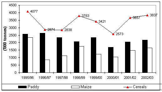 In 2002, the reported cultivated area under paddy was 582 857 hectares, an increase of 2 percent on the previous year's area, part of which came from other crops. Given the energy constraints with intensive pumping of water this season, a possible future trend may lead to a decrease in paddy cultivation on some irrigated lands, unless gravity-fed irrigation water can be provided. Crop substitution in these areas with maize replacing paddy is likely.