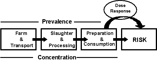 The first steps of this process, hazard identification, hazard characterization and the conceptual model for exposure assessment were presented at an expert consultation in July 2001, and summarized in the report of that consultation.[4] The exposure assessment model described the production-to-consumption pathway for fresh and frozen broiler chicken carcasses prepared and consumed in the home.