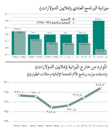 ومنذ 1994، انخفضت ميزانية البرنامج العادي للمنظمة بالأرقام الحقيقية بنسبة 24.3 في المائة. وفي الفترة المالية 1994-1995، بلغت ميزانية المنظمة 673 مليون دولار أمريكي. وكانت المحافظة على القوة الشرائية على حالها، رغم انخفاض قيمة الدولار الأمريكي، تفترض وجود ميزانية قدرها 931.3 مليون دولار أمريكي للفترة المالية 2004-2005. لكنه تمّت عوضاً عن ذلك الموافقة على ميزانية قدرها 749.1 مليون دولار أي بانخفاض في البرنامج بلغ 51.2 مليون دولار أمريكي مقارنة مع الفترة المالية 2002-2003. وتتألف الأموال من خارج الميزانية من المساهمات الطوعية المقدمة إلى المنظمة في المقام الأول من الحكومات ومن أجهزة الأمم المتحدة (مثل برنامج الأمم المتحدة الإنمائي، ومكتب الأمم المتحدة لتنسيق الشؤون الإنسانية) ومؤسسات التمويل الدولية (مثل البنك الدولي). ورغم الانخفاض المستمر في الأنشطة الممولة من برنامج الأمم المتحدة الإنمائي التي من المتوقع ألا تتعدى 12.2 مليون دولار أمريكي في الفترة 2004-2005 في مقابل 148.4 مليون دولار أمريكي في الفترة 1994-1995، بقي مجموع مشاريع التنمية الممولة من مساهمات طوعية أخرى مستقراً نسبياً في تلك الفترة، بل وزاد بشكل ملحوظ في الفترات المالية الثلاث الأخيرة من 245.8 مليون دولار أمريكي في الفترة 1998-1999 إلى 286.7 مليون دولار أمريكي متوقعة في الفترة 2004-2005 (أنظر الرسم البياني). وفي نفس الفترة، تفاوتت بقدر كبير الموارد من خارج الميزانية المخصصة للمساعدات الطارئة تبعاً للظروف، من 55 مليون دولار أمريكي في الفترة 1994-1995 لتصل ذروتها في الفترة 2000-2001 إلى 325 مليون دولار أمريكي مرجعها إلى البرنامج الخاص بالعراق ويتوقع أن تبلغ 200 مليون دولار أمريكي في الفترة 2004-2005.