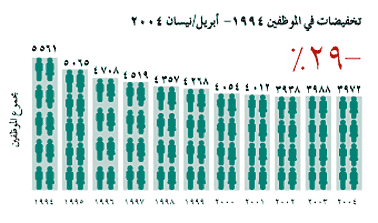 - خفض عدد الموظفين - خلال فترة العشر سنوات من يناير/كانون الثاني 1994 إلى أبريل/نيسان 2004، خفّضت المنظمة ملاك الموظفين (البرنامج العادي والموظفين الميدانيين) بنحو 29 في المائة من 5560 موظفاً إلى 3972 موظفاً. وتركّزت الجهود على تقليص عدد طبقات الإدارة وعدد الوظائف في الدرجات العليا وزيادة نسبة الموظفين في الدرجات الدنيا. وأدّت هذه الاستراتيجية إلى انخفاض بنسبة 27 في المائة في الوظائف من فئة مدير وفي زيادة 42 في المائة في الوظائف من فئة الفنيين الشباب..
