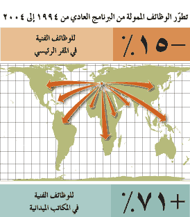 - اللامركزية - سعيا إلى جعل العمليات قريبة من مواقع الحاجة الماسة إليها،أنشأت المنظمة خمسة مكاتب إقليمية فرعية جديدة تعمل فيها فرق متعددة الاختصاصات تقدم الخدمات لمجموعات من البلدان ذات السمات المشتركة. كما أن مجموعات الموظفين الفنيين والمعنيين بالمساعدة في مجال السياسات وبالعمليات نقلوا من المقرّ إلى العمل الميداني. وطبّقت اللامركزية على نطاق واسع أدّى إلى زيادة بنسبة 71 في المائة في عدد الوظائف الفنية في المكاتب الميدانية. وارتفعت نسبة موظفي المكاتب الميدانية إلى موظفي المقر من 18.5 في المائة عام 1994، إلى 27.3 في المائة عام 2004. وفي الفترة المالية 2004-2005، تتوقّع المنظمة أن تكون ممثَّلَة في 133 بلداً عضواً مقابل 106 بلدان أعضاء عام 1994. وجرى تعزيز الصلات على المستوى القطري من خلال تعيين موظفين فنيين قطريين مؤهّلين بتكاليف تقل كثيرا عن تكاليف الموظفين الدوليين