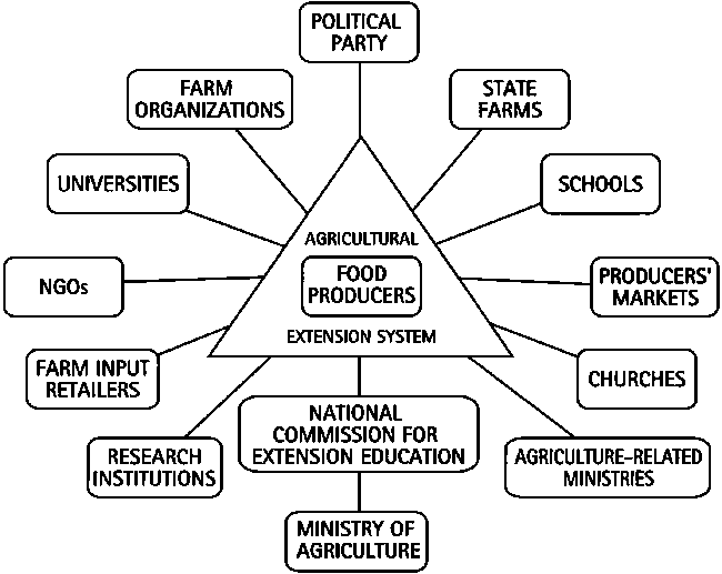 The Ministry of Science, Technology and Environment, established in 1994 as part of the reorganization of the Cuban State apparatus, appears to be the main organism of the State central administration charged with elaborating and proposing to government all matters concerning science, technology, innovation and the environment. However, decision-making authority and implementation control are increasingly devolved to a range of participants. "In a sense, a decentralized, lightly coordinated extension system has evolved, one focused on increasing AKIS efficiency in support of food security" (Carrasco, Acker and Grieshop, 2003).