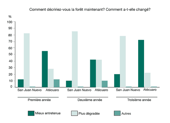 Un peu moins de la moitié des jeunes de San Juan Nuevo estimaient que leur forêt communautaire était bien soignée mais qu’elle avait été mieux entretenue dans le passé. Plus de 60 pour cent des étudiants d’Atécuaro pensaient que leur forêt communautaire était bien tenue. Moins de 10 pour cent ont répondu «je ne sais pas» et 30 pour cent étaient de l’avis que la forêt avait été endommagée. Dans les deux communautés on estimait que la forêt continuerait à se dégrader. La majorité des jeunes était consciente du fait que lorsque des terres boisées sont défrichées, la biodiversité et les aires de loisirs se perdent et le climat change aussi. Un peu plus du tiers des jeunes des deux communautés se rendaient compte de la disparition des espèces. Quarante-trois et 31 pour cent des élèves de San Juan Nuevo et d’Atécuaro, respectivement, associaient la perte de la forêt à la perte d’oxygène.
