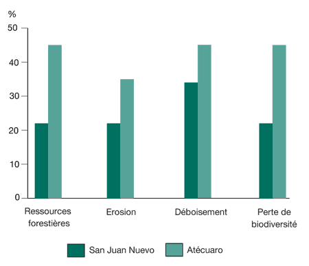 Les résultats montrent que les jeunes gens des deux communautés avaient fort peu de connaissances sur ces concepts (figure 2). Le groupe de San Juan Nuevo en était encore moins au courant que celui d’Atécuaro malgré les politiques de gestion intégrée de la première communauté; 20 pour cent comprenaient le concept de ressources forestières, érosion et perte de biodiversité et moins de 35 pour cent savaient ce qu’était le déboisement.
