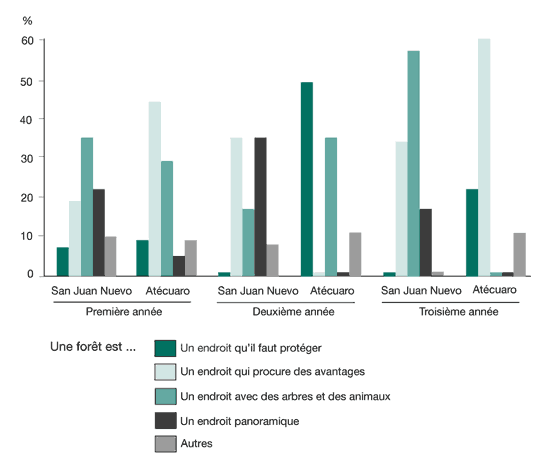 Trente-quatre pour cent et 22 pour cent des jeunes gens d’Atécuaro et San Juan Nuevo, respectivement, ont décrit la forêt d’un point de vue biologique, à savoir un endroit avec beaucoup d’arbres et d’animaux (figure 3). Vingt-huit pour cent des étudiants d’Atécuaro estimaient que la forêt était un lieu ayant besoin de protection (cette opinion était plus répandue parmi les étudiants de la deuxième année). Seuls 8 pour cent des étudiants de San Juan Nuevo, tous des élèves de la première année, partageaient cette opinion. Soixante-deux pour cent des étudiants d’Atécuaro (troisième année principalement) ont décrit la forêt comme un endroit qui procure des avantages. Pour les autres, la forêt était un lieu panoramique.