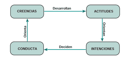 D’après la théorie de l’action raisonnée de Fishbein (1967), il existe un lien causal entre les croyances et les comportements; les croyances créent les attitudes qui, elles, aboutissent à des intentions, et les intentions déterminent le comportement (figure 4).
