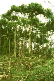Dense stand of African Tulip Tree (Spathodea campanulata) in Fiji. The tree is a serious problem to the economy of the country.