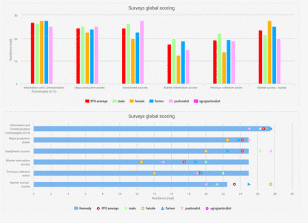 El análisis de datos integrado y las herramientas de visualización que permiten realizar un primer análisis de datos en la tableta; esto incluye opciones para comparar los resultados entre la gente (por ejemplo, agricultor vs pastor; hombre vs mujer) y visualizar datos a través de gráficos que ofrecen una rápida revisión del estado de resiliencia de diferentes hogares e individuos.