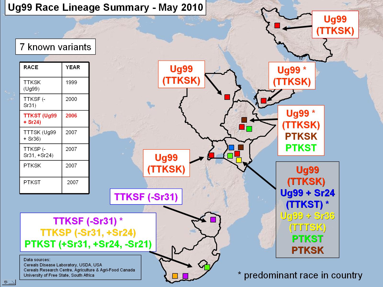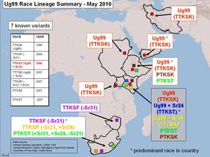 وتعتبر سلالة TTKST ("الشكل Sr24 لسلالة Ug99") الآن هى السلالة الغالبة من صدأ ساق القمح في العينات التي جمعت من كينيا. وقد تسببت هذه السلالة، التي جرى الكشف عنها عام 2006، في ظهور أوبئة في كينيا عام 2007. وسلالةTTKSK ("سلالة Ug99 الأصلية") هي سلالة سائدة في إثيوبيا واليمن. وتأكد وجود سلالــــةTTKSK ("سلالة Ug99 الأصلية") من العينات في السودان وجمهورية إيران الإسلامية.
