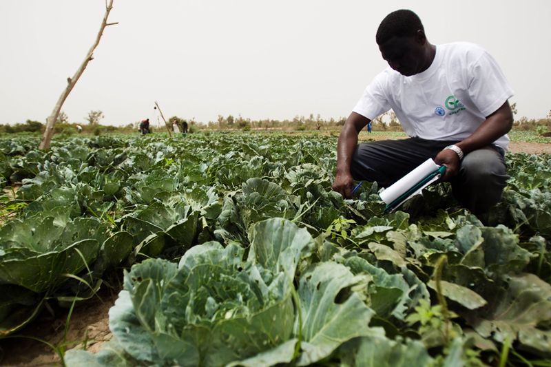 17 May 2010, Thiaye, Senegal – IPPM focal point Amadou Diakhate checking on a cabbage crop. Amadou Diakhate has trained farmers who have themselves become trainers who teach their peers in improved farming techniques.