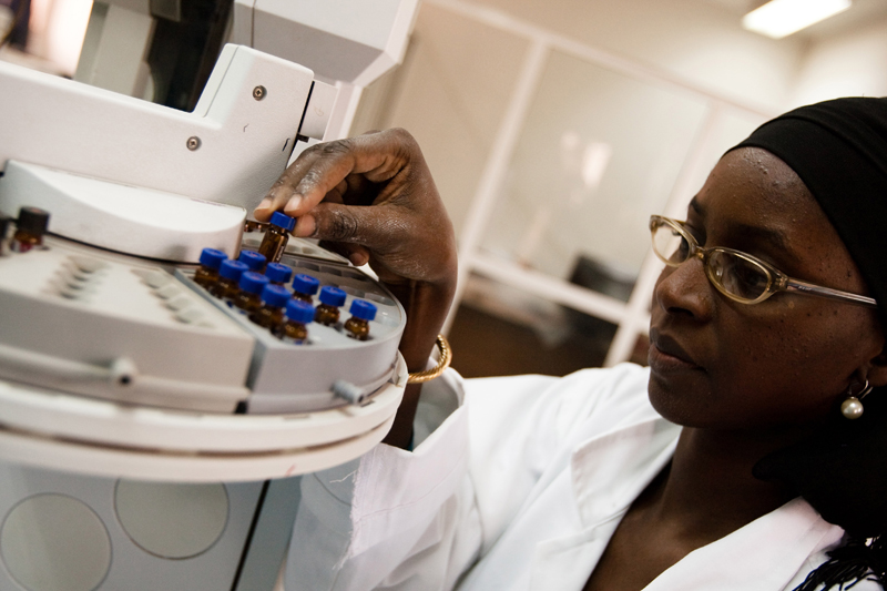 18 May 2010, Dakar, Senegal - Chemical engineer Anna Ndiaye at the Ceres Locustox Laboratory positioning vials containing samples into a machine used to analyze and detect pesticides. EP/INT/606/GEF: Reducing Dependence on POPs and other Agro-Chemicals in the Senegal and Niger river basins through Integrated Production, Pest and Pollution Management.