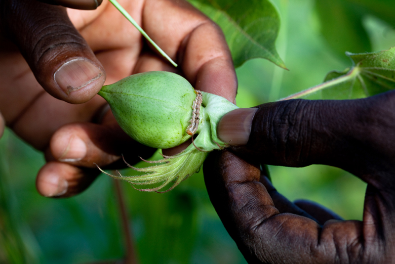 Mali – Training of facilitators in the cotton fields. Examining larve of heliocoverpa armigera on a cotton bud.