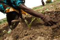 Senegal – A farmer trained in Integrated Production and Pest Management (IPPM) through the Farmer Field Schools stirring the soil around cabbage seedlings in a trial garden to facilitate root growth.