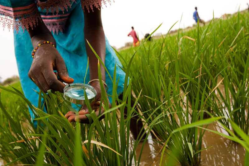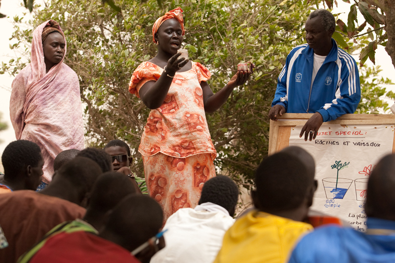 20 May 2010, Kodith, Senegal – A group of farmers learning about insect damage and pesticide use at a Farmer Field School (FFS). The FFS Facilitator Abou Harouna Anne (left) was trained under the IPPM Programme to teach farmers about improved farming techniques.