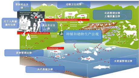与废物、水、土壤和环境相关的监管框架也应当针对抗微生物药物使用和其耐药性包含相关要素,特别是解决包括医院、饲料厂、制药厂、市政水源和农场在内的关键源头排放包含抗微生物药物残留和耐药微生物的废物和废水问题。这些领域的监管框架规范可能对抗微生物药物耐药性造成影响的活动,并考虑到监测和控制土壤和水源污染的需要。 水法应进一步处理水的获取和可能受污染水的允许使用方面的问题。。