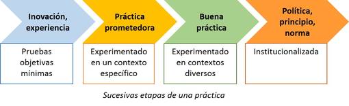 Una buena práctica suele evolucionar en cuatro etapas. Al principio, una innovación potencial realizada como experiencia piloto o técnica o tecnología innovadora parece tener resultados mínimos. Después de experimentarla varias veces en un determinado contexto, se convierte en una práctica prometedora; es decir, en una práctica que tiene éxito en su contexto específico pero constituiría un riesgo aplicarla en un contexto distinto. Por último, cuando haya arrojado resultados positivos en diversas réplicas y contextos se la podrá calificar como buena práctica, plausible de ser compartida ampliamente para que otros puedan adaptarla y adoptarla. En algunos casos una buena práctica puede evolucionar e institucionalizarse, por ejemplo, cuando se convierte en la base que sustenta la formulación de una nueva política o norma.