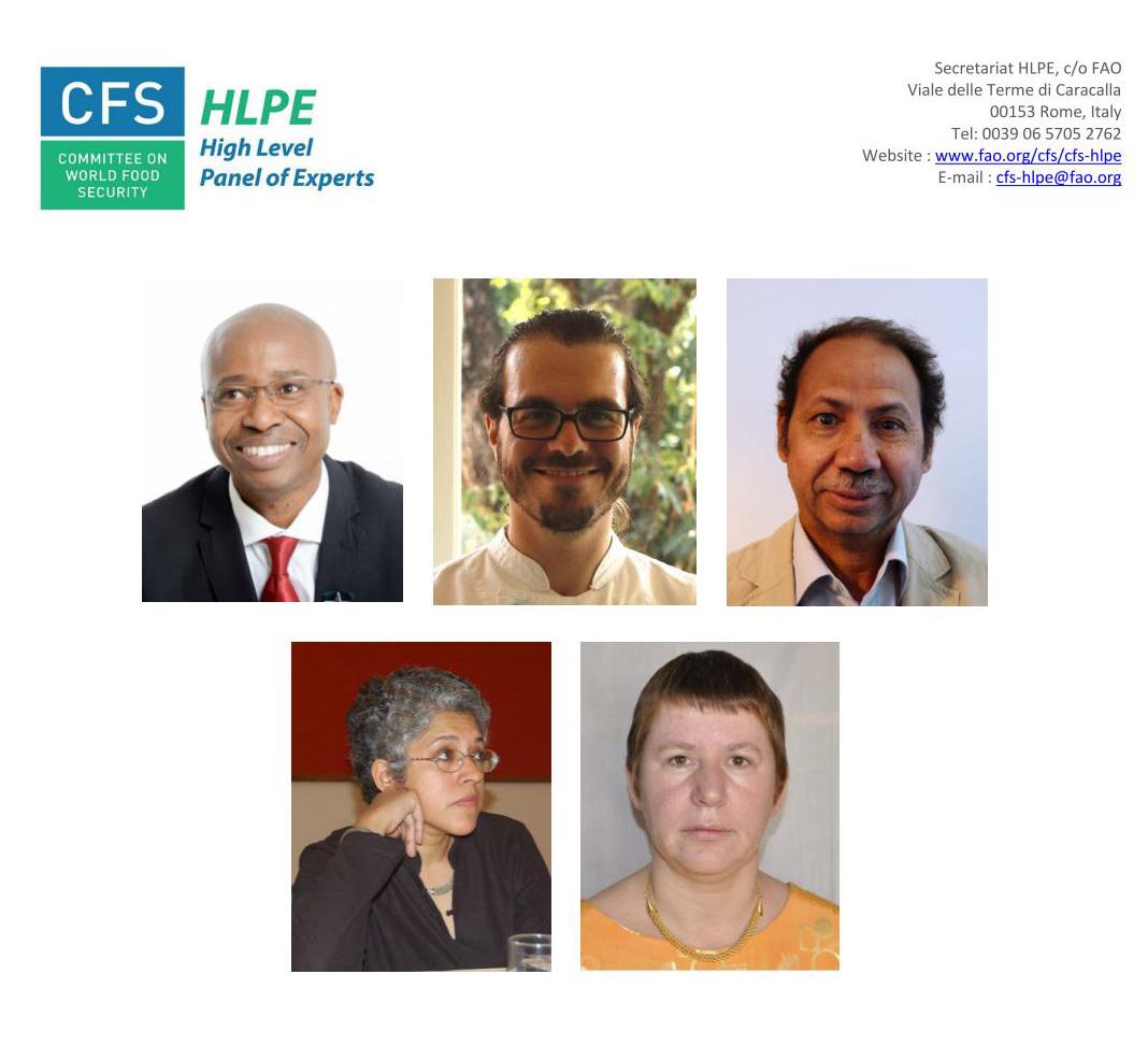 The HLPE Steering Committee announces the appointment of the following 5 experts to carry out the studythat will feed into the CFS debates at its 45th session in 2018:
