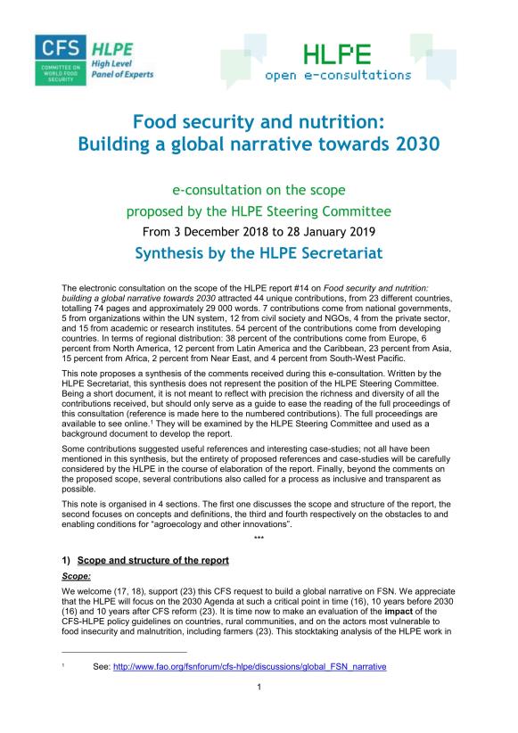 The full proceedings of the open eConsultation (03 December 2018 - 28 January 2019) on the Scope for the HLPE report on Food Security and Nutrition: Building a global narrative towards 2030 are now available at this page.