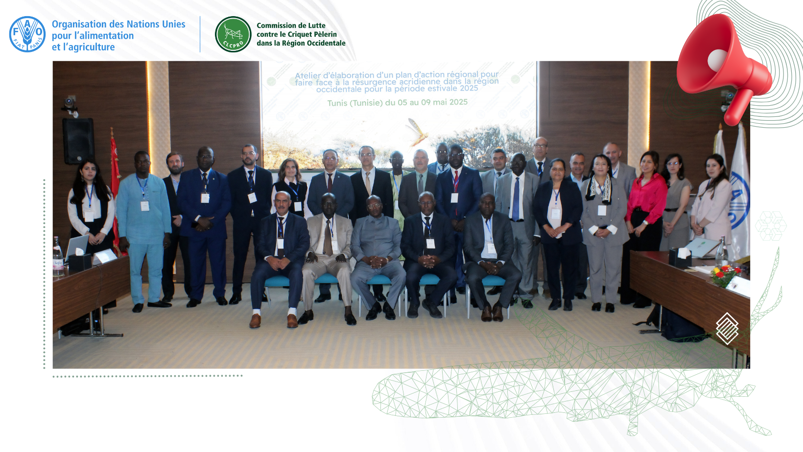 The Commission for Controlling the Desert Locust in the Western Region (CLCPRO) was created under the provisions of Article XIV of the FAO Constitution. It comprises 11 member countries from West and North-West Africa: Algeria, Burkina Faso, Gambia, Libya, Mali, Mauritania, Morocco, Niger, Senegal, Chad and Tunisia.The purpose of the CLCPRO is to promote, at national, regional and international level, all actions, including research and training, to ensure rational and sustainable management of preventive control and to deal with Desert Locust invasions in the western region of its habitat, comprising West and North-West Africa.