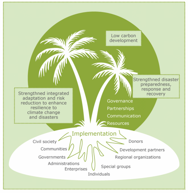 - Framework for Resilient Development in the Pacific, 2017-2030 (FRDP) is a regional process that provides scope for linking disaster risk reduction and climate-smart agriculture. The Framework, which promotes an integrated approach for addressing climate change and disaster risk management, also provides voluntary guidelines for the Pacific Islands Region. The framework has three main goals (Figure C5.5): strengthened integrated adaptation and risk reduction to enhance resilience to climate change and disasters; low-carbon development; improved disaster preparedness, response and recovery. It recognizes the important role of different economic sectors, referring in particular to agriculture, fisheries, forestry, for implementing cross-cutting measures that address climate change and disaster risk reduction in tandem. However, the Framework does not enter deeply into sectoral issues. This is an area where disaster risk reduction and climate-smart agriculture could make a valuable contribution.