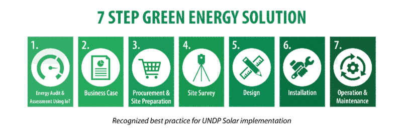 Indeed, UNDP’s Green Energy team has aided FAO’s path towards renewable sources of energy by designing, supplying, installing, and commissioning solar photovoltaic systems and energy storage solutions in respective locations as well as numerous other services including technical advisory, sourcing of materials, and the installation of energy meters. Through a 7 step process, engineers from both teams work together to determine the best solar power solutions for the energy needs of each location.