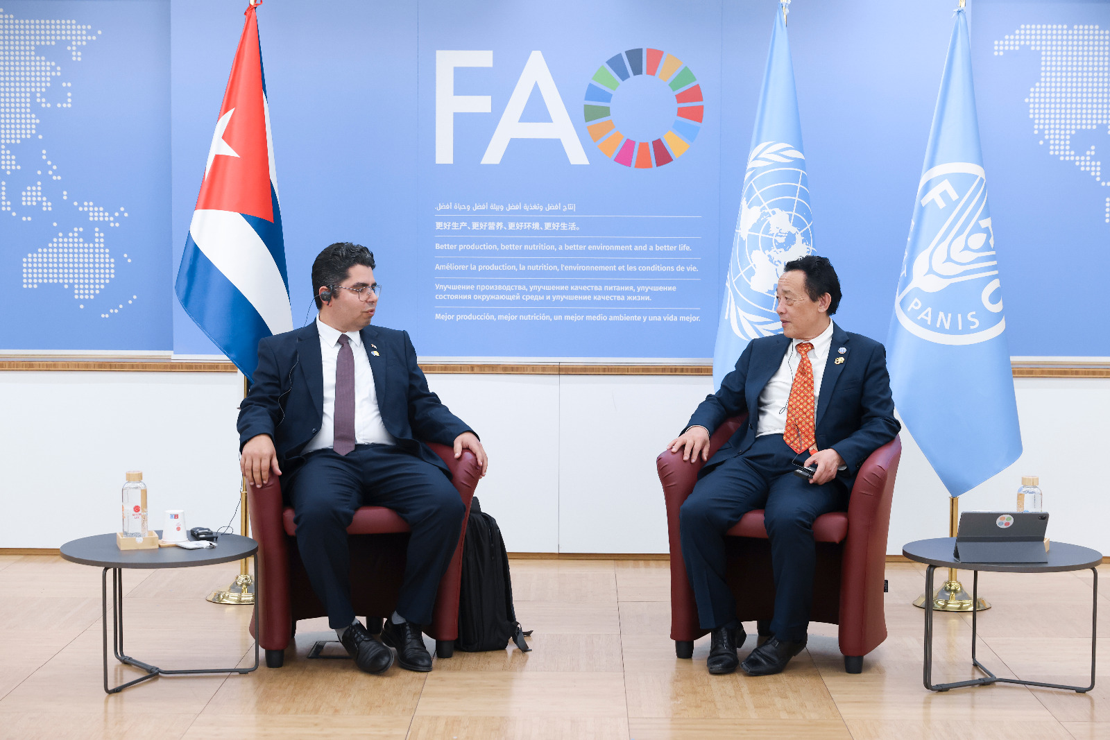 Rome – FAO Director-General, Dr QU Dongyu, met today with His Excellency Telce González Morera, Deputy Minister for Agriculture of Cuba, on the margins of the World Food Forum 2025 taking place at the Organization’s headquarters in Rome.