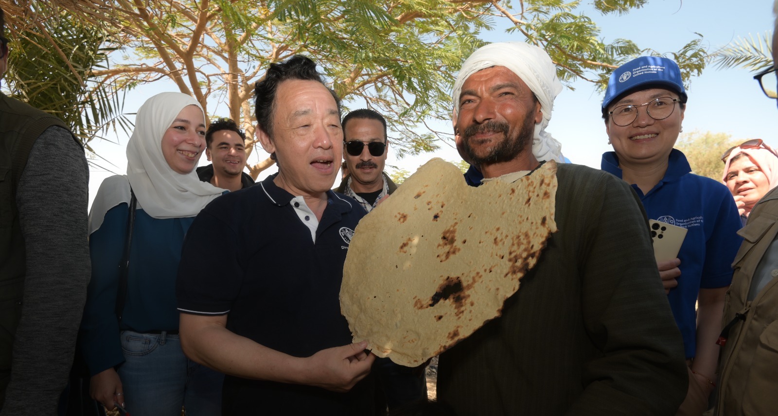在考察中,屈总干事品尝了埃及传统特色薄饼,并与多位当地农民进行亲切交谈。屈总干事指出,农村妇女在改善生计、加强粮食安全和促进实现可持续发展目标方面发挥着举足轻重的作用,强调尊重妇女是现代文明的重要体现。