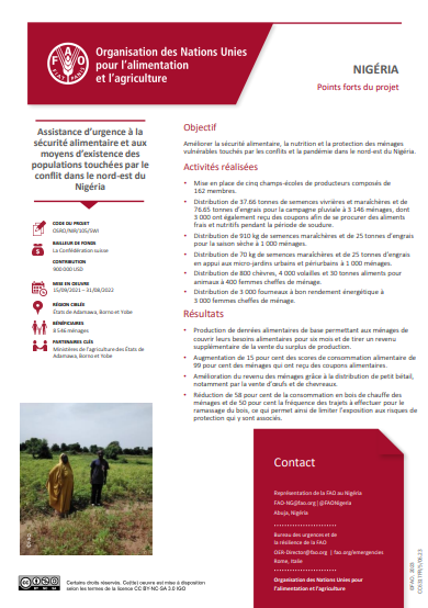 Le projet "Assistance d’urgence à la sécurité alimentaire et aux moyens d’existence des populations touchées par le conflit dans le nord est du Nigéria" financé par la Confédération suisse, avait pour objectif d'améliorer la sécurité alimentaire, la nutrition et la protection des ménages vulnérables touchés par les conflits et la pandémie dans le nord-est du Nigéria.