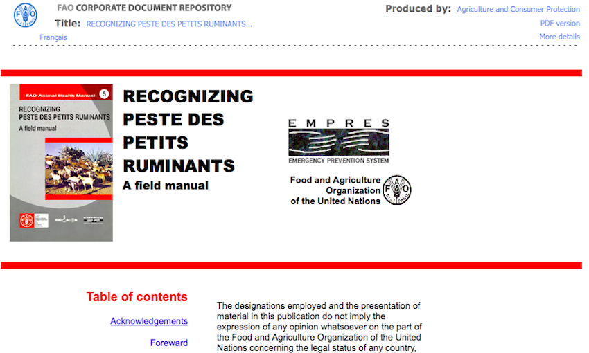 Peste de Petits ruminants (PPR) represents a differential diagnosis for foot-and-mouth disease. The manual gives an overview of the pathogenesis, epidemiology, clinical signs, diagnosis and differential diagnosies of PPR. It contains some information about PPR vaccination and control as well as some photos of PPR lesions in goats and sheep.