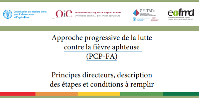 Approche progressive de la lutte contre la fièvre aphteuse (PCP-FA), développée par la FAO et l'EuFMD et approuvée par l'OIE, guide les pays endémiques à travers une série d'étapes progressives pour mieux gérer les risques de fièvre aphteuse. Ce document expose principes directeurs, description des étapes et conditions à remplir pour le PCP-FA.