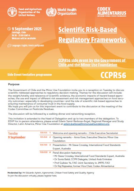 Codex members and observers are kindly invited to work constructively to make recommendations to facilitate consideration and decision-making by CCPR. The meetings will be conducted in English only. To attend the meetings, please click here to register. Registration is open to Codex Members and Observer organizations, regardless of whether they will be participating in person in the plenary session. SIDE EVENTS Side event on Scientific Risk-Based Regulatory Frameworks (9 September 2025, 6.30pm - 8.00pm GMT-4) For further information click here. Interpretation will be available in English, French and Spanish. Side event on Best practices guidance for data submitters to JMPR (11 September 2025, 6.00pm - 7.00pm GMT-4) For further information click here. English only. Side event on Global Pest And Disease Priorities for Minor Crops by the Global Pulse Confederation (11 September 2025, Lunchtime) Lunchtime event. Lunch and interpretation will be provided. DOCUMENTS JMPR Reports The report of the regular meeting of the Joint FAO/WHO Meeting on Pesticide Residues (JMPR) that took place in September 2024 is available from the FAO and WHO websites concerning MRL recommendations arising from this Meeting (Agenda Item 6.1) and as background information for matters for consideration under Agenda Items 5(a) and 5(b). JMPR reports are available in English only. Circular Letters The list of CLs relevant to CCPR56 is available from "Related Circular Letters”. Working Documents Documents for consideration by CCPR56 will be published on this page as soon as they become available. They will be available in English, French and Spanish. Some working documents may be available in English or original language only. Conference Room Documents (CRDs) will be kept in original language. No printed copies of working documents will be made available for the plenary session. Report The draft report will be available in English, French and Spanish. Appendices will be available in English only. The draft report and appendices will not be printed but will be made available online. PHOTO GALLERY |