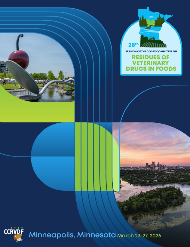 GENERAL INFORMATION The 28th Session of the Committee on Residues of Veterinary Drugs in Foods will be held from 23 to 27 March 2026 in Minneapolis, Minnesota, United States of America. The plenary sessions and the physical meetings of working groups will be webcast on YouTube in listening mode in English, French, and Spanish. Remote participation (via Zoom) in the physical working group meetings and plenary sessions will be possible for registered delegates from Codex members and observers, with listening and verbal interventions in English, French, and Spanish. INFORMATION FOR DELEGATES Practical information for delegates planning to attend CCRVDF28, including hotel registration, visa application, etc., is here available in English, French and Spanish. ONLINE PRE-REGISTRATION All participants who will physically attend the meeting should provide their information (names and addresses) through the Codex Online Registration System by accessing the Login on the Codex webpage by 23 February 2026 at the latest. All Codex Contact Points and Contact Points of Observer Organizations have been provided with login credentials and a password for online registration. If you have not received the login and password, please contact [email protected]. PRE - MEETINGS General Information In preparation for CCRVDF28, the Working Group on the Priority List of Veterinary Drugs for Evaluation/Re-Evaluation by JECFA will meet on Sunday, 22 March 2026, to consider comments submitted in reply to relevant circular letters, in particular CL 2026/15-RVDF, to prepare recommendations for consideration by the Plenary Session, and discuss any other comments/concerns raised by Codex members/observers during the discussion of this item. The goal is to facilitate discussion and decision-making by CCRVDF28. Other working group meetings may also be scheduled and posted here in due course. Documents Supporting documents include working documents, comment papers, circular letters, and conference room documents (CRDs), published on this page. Any additional documents prepared by the Working Group Chairs will be published on this page. Working Groups