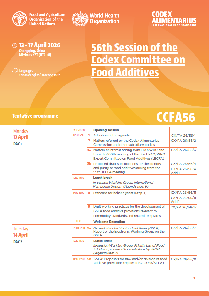 GENERAL INFORMATION The 56th Session of the Codex Committee on Food Additives (CCFA56) has been scheduled to take place in Chongqing, China from 13 - 17 April 2026. Physical working groups (PWGs) will take place on 10 and 11 April 2026 (see details below). The plenary sessions of CCFA56 and the PWGs will be webcast live in Chinese, English, French, and Spanish. PHYSICAL WORKING GROUPS (PWGs) The following sessions are planned (English only): Provisional Agenda for GSFA PWG